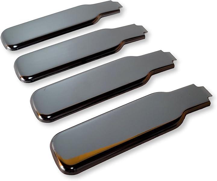 商品仕様 : ・材質:ABS樹脂 ・仕上げ:メッキ処理、鏡面仕上げ ・セット内容:4枚 ・取り付け方法:両面テープ付属