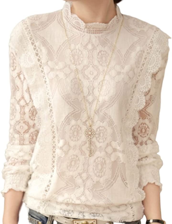 High Neck Lace Blouse Long Sleeve Women's White Spring Summer Top Embroidered Feminine Slim Silhouette Large
