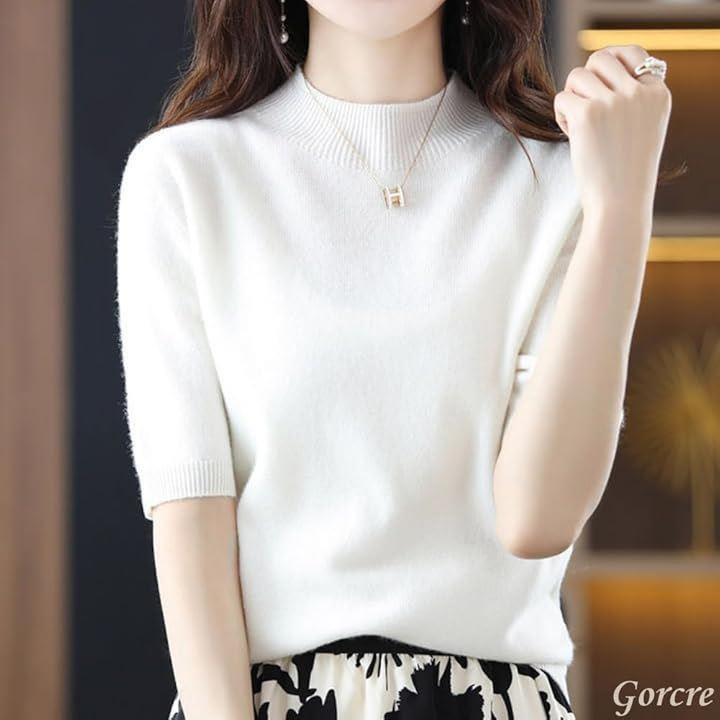 「ずっと続く美シルエット」かゆくない・伸縮・あったかで、春・秋・冬はずっと上品美シルエットでおまかせ。ハイネックでリブニット半袖トップスのお届けです。