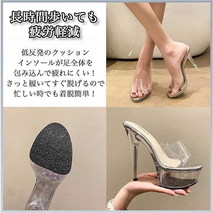 透明ストラップが素肌と一体化し、足とヒールの境界線を感じさせないため、視線が脚の縦ラインに集中。