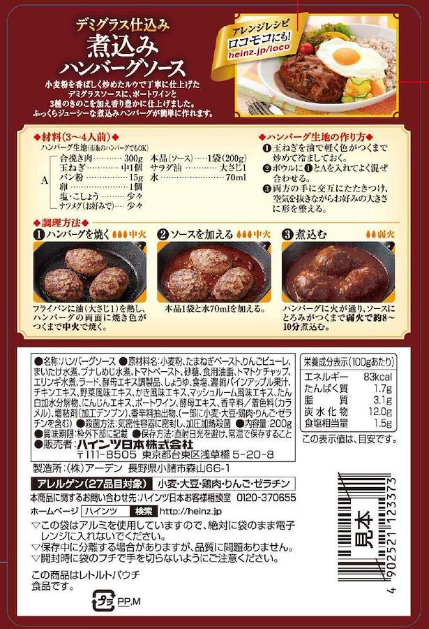 小麦粉を香ばしく炒めたルウで丁寧に仕上げたデミグラスソースに、ポートワインと3種のきのこを加え香り豊かに仕上げました。ふっくらジューシーな煮込みハンバーグが簡単に作れます。 ハインツ日本は1961年に設立され、デミグラスソースやホワイトソースなどの洋風クッキングソースと冷凍フライドポテトなどの洋食分野で、家庭用のみならず業務用商品においても、そのおいしさと品質が高い評価を受けています。