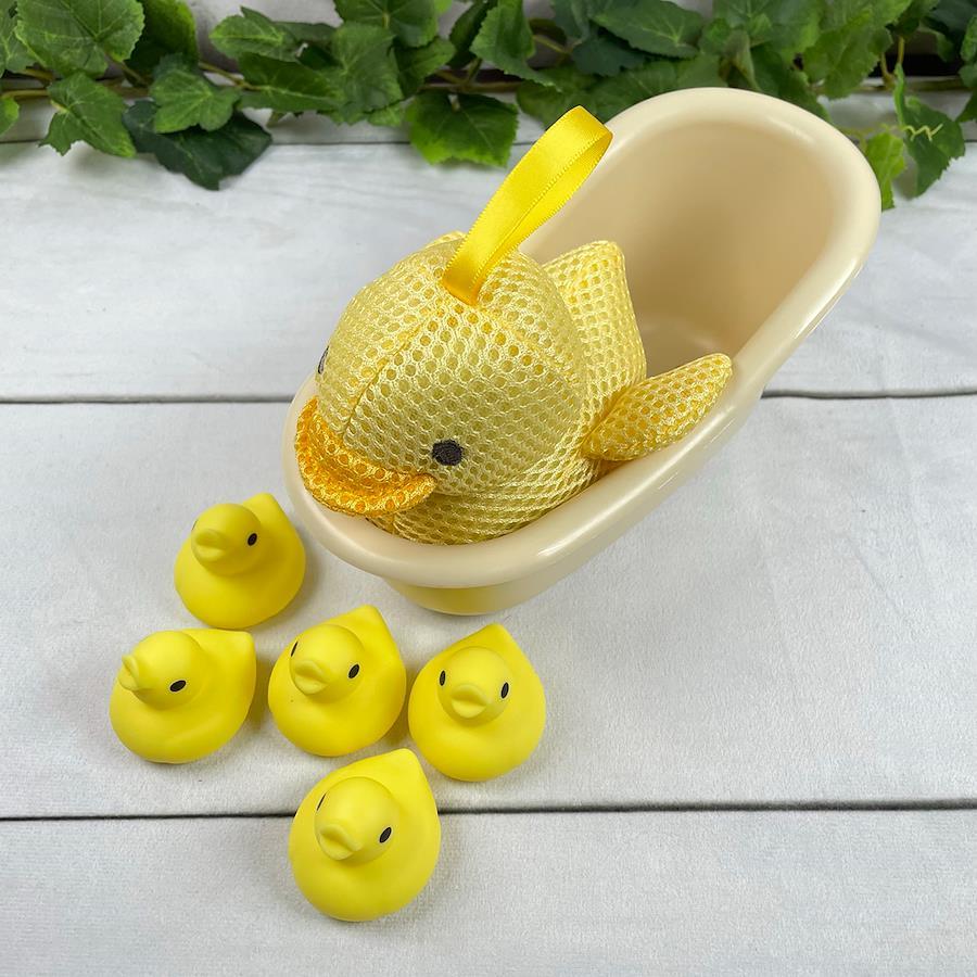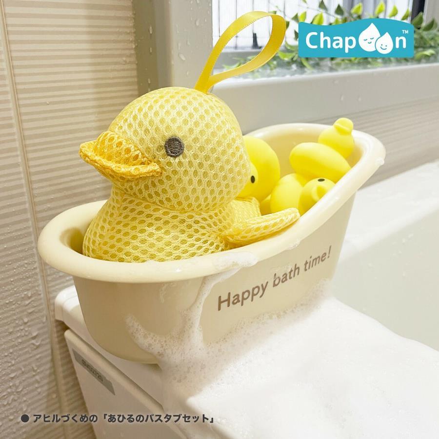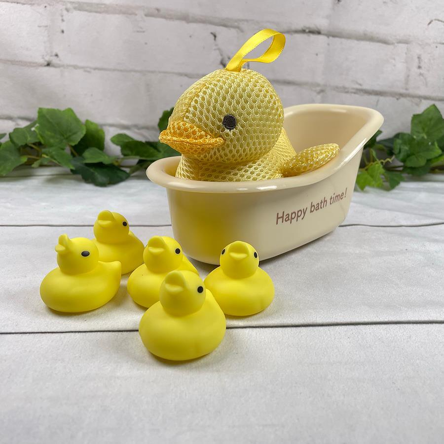 バススポンジとぬいぐるみが一つになった「バスぐるみ(あひる)」と、お風呂に浮かぶミニあひる(5羽)、ミニバスタブがセットになったセットが新登場です。お風呂といえば「あひる♪」づくめでお風呂タイムを一段と楽しいひと時に変えてくれます。バスぐるみの中には錆びないプラ製の鈴、ミニあひるは水が入らない設計、バスタブには水切り穴付きで衛生的。