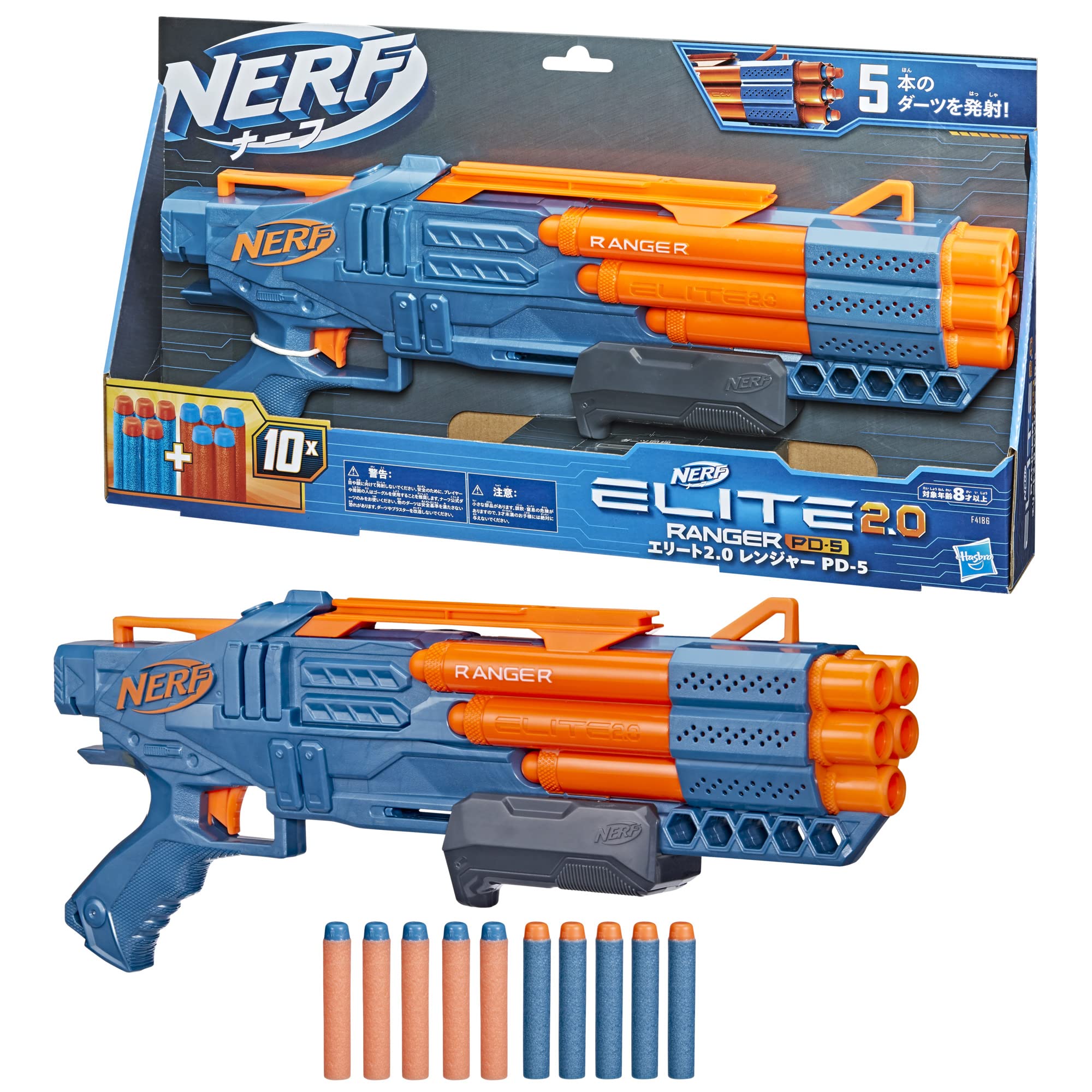 【フロントにバレル5個がついた手動ブラスター】ナーフ エリート2.0 レンジャー PD-5 は、ダーツを5本装填できるフロントバレルを搭載したポンプショットガンです。【ポンプアクションでダーツ発射】スポンジ銃のダーツを装填して、プライミングスライドを前後に動かしてトリガーを引くと、ダーツが1本発射されます。電池不要の手動駆動ブラスターです。【ダーツストレージを搭載】ダーツを5本格納できるストレージが搭載されているので、追加のダーツを素早くブラスターに装填することができます。【ナーフ公式ダーツが10本標準付属】バレルに5本装填し、ダーツストレージに5本格納することができます。ナーフプレイを続けながら、ダーツのリロードを簡単に素早く行うことができます。【アップグレード性に優れた エリート2.0のブラスター】本ナーフ エリート2.0 レンジャー PD-5 ブラスターには、ストック装着ポイントが付いているので、バトルやミッションごとにブラスターをカスタマイズしてお楽しみいただけます。 (ストックおよび追加商品は別売です)。【おもちゃ 男の子 ギフト】男の子のおもちゃとして人気のシューティングおもちゃになります。スポンジ銃なでできたダーツは、お子さんでも遊びやすいです。8才男の子プレゼントとしていかがでしょうか。【免責事項】メーカーによる商品リニューアルに伴いパッケージが変更が行われた場合、新パッケージでお届け致します事ご了承願います。