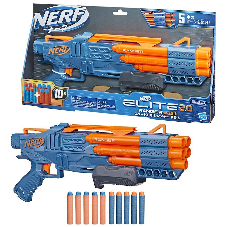 【フロントにバレル5個がついた手動ブラスター】ナーフ エリート2.0 レンジャー PD-5 は、ダーツを5本装填できるフロントバレルを搭載したポンプショットガンです。【ポンプアクションでダーツ発射】スポンジ銃のダーツを装填して、プライミングスライドを前後に動かしてトリガーを引くと、ダーツが1本発射されます。電池不要の手動駆動ブラスターです。【ダーツストレージを搭載】ダーツを5本格納できるストレージが搭載されているので、追加のダーツを素早くブラスターに装填することができます。【ナーフ公式ダーツが10本標準付属】バレルに5本装填し、ダーツストレージに5本格納することができます。ナーフプレイを続けながら、ダーツのリロードを簡単に素早く行うことができます。【アップグレード性に優れた エリート2.0のブラスター】本ナーフ エリート2.0 レンジャー PD-5 ブラスターには、ストック装着ポイントが付いているので、バトルやミッションごとにブラスターをカスタマイズしてお楽しみいただけます。 (ストックおよび追加商品は別売です)。【おもちゃ 男の子 ギフト】男の子のおもちゃとして人気のシューティングおもちゃになります。スポンジ銃なでできたダーツは、お子さんでも遊びやすいです。8才男の子プレゼントとしていかがでしょうか。【免責事項】メーカーによる商品リニューアルに伴いパッケージが変更が行われた場合、新パッケージでお届け致します事ご了承願います。
