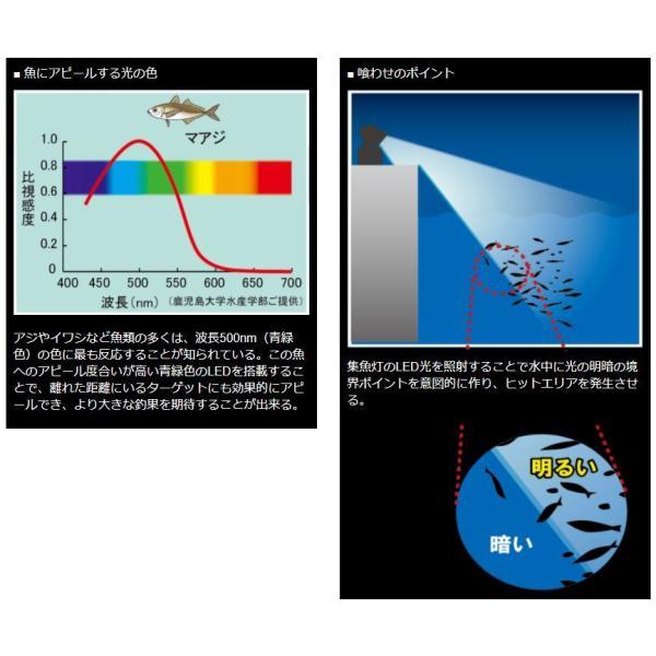 水面にターゲットを寄せる!夜のサイトフィッシングに最適!表層に魚を寄せてヒットポイントを絞り込む 魚を寄せる波長500nmの青緑色や用途を広げる電球色にも切り替え可能 ポイントに合わせて角度調整が可能で明暗の境界が作れる 雨でも使える防滴構造(IPX4) アジ・メバルだけでなくタチウオやホタルイカなどにもおすすめ【使用電池】乾電池単1型 4本 (別売)【使用光源】青緑色LED、電球色LED【使用温度範囲】0 ~ 40℃【電池寿命(20℃時)】青緑色:連続約10時間 電球色:連続約10時間 (Panasonicアルカリ乾電池使用)【光束】青緑色:約150lm、電球色:約300lm【防水】IPX4【外形寸法】約 幅125mmx奥行130mmx高さ200mm (フック収納時、首振り部が横向き時)【重さ】約1.3kg (専用バッグ、Panasonicアルカリ乾電池含む)【付属品】 専用バッグ