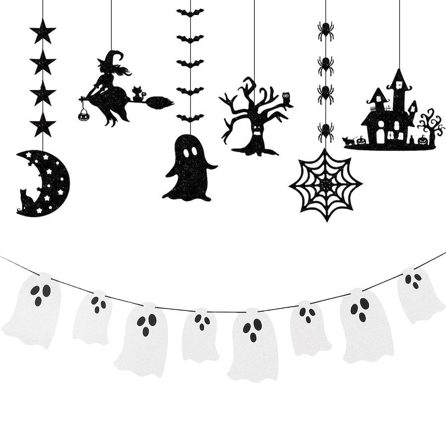【使いやすい】6つの黒いガーランドが組み立てられており、直接飾ることができます。おばけガーランドは組み立てていない状態で紐が付いており、大小8つのおばけに紐を通すだけで完璧なおばけガーランドが完成します。取り付けも取り外しも簡単で、好きな場所に掛けられます。