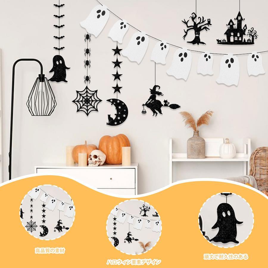 5営業日以内に発送ー【新品未開封品】【パッケージ】ハロウィンガーランド7本セット。ブラックガーランド6本+おばけガーランド1本(おばけ8個で構成)。 【素材】ハロウィンフラッグは高品質の紙で作られており、素材は厚く、丁寧な仕上がりで、耐久性があり、色褪せたり壊れたりしにくく、長寿命です。ラメが入っていてキラキラしていてとても繊細です! 【ハロウィンの雰囲気】リースには幽霊、コウモリ、クモ、クモの巣、魔女、城、猫などのハロウィン要素のパターンがあります。お好きな場所に飾って、怖くて神秘的なハロウィンの雰囲気を演出できます。ハロウィンパーティーをもっと楽しく、ワクワクさせましょう! 【使いやすい】6つの黒いガーランドが組み立てられており、直接飾ることができます。おばけガーランドは組み立てていない状態で紐が付いており、大小8つのおばけに紐を通すだけで完璧なおばけガーランドが完成します。取り付けも取り外しも簡単で、好きな場所に掛けられます。 【適用場所】壁、窓、天井など、どこにでも飾って豊かなハロウィンの雰囲気を演出し、雰囲気を盛り上げ、ハロウィンの楽しみを楽しめます。ハロウィン、誕生日、 パーティー、庭園、ショップ、レストラン、オフィス、学校、その他の場所に適しています。 写真の小道具としても使用でき、とても美しいです!
