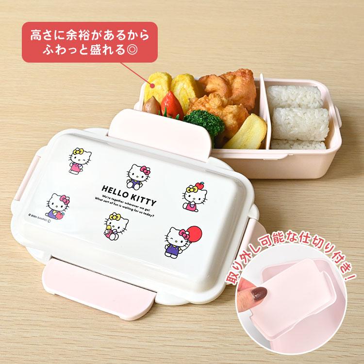 【ハローキティランチボックス】レトロなハローキティのイラストが可愛いシンプルな1段タイプのお弁当箱。汁もれしにくい4点ロック式で、高さに余裕があるのでふわっと盛りつけができておかずが潰れません◎盛り付けに便利な仕切り付き。フタを外せばレンジで温めも可能、食洗機もOKなのでお手入れもラクラク♪安心の日本製アイテムです。