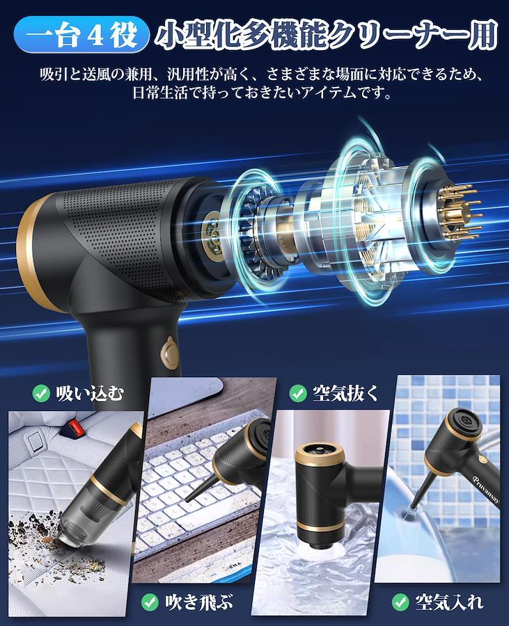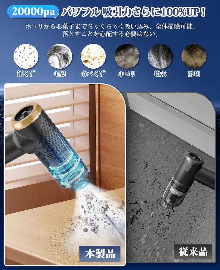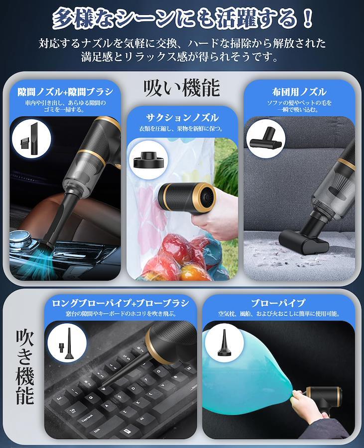 通常1-5営業日で発送【新品未開封品】【20KPa強力吸引&120W高出力モーター&1台4役】Pruvansayハンディクリーナーは120w電動ブラシレスモーターを搭載し、吸引力20000Pa以上に達します!高性能はもちろん、4in1機能もダントツ:?吹き飛ぶ?吸い込む?空気入れ?空気抜き。普通のブラシモーターと比べて、動作時の摩擦が50%軽減され、パワーが100%UP!ミニ掃除機、電動エアダスター、エアポンプ、真空パック機として使用できます。車内、ソファ、部屋、エア枕、浮き輪、衣類圧縮、貯蔵袋など様々なシーンで活躍!2024年革新的、1台で多機能を備えたマルチユースなハンディクリーナー。【2way仕様&7種類ノズル&コードレス式】吸い込み&吹き出し2wayの機能を持つように設計されている車用掃除機、付属の7種類のノズルを簡単に取り替えることで、車全体/家全体の掃除を実現!ホコリ、紙くず、髪の毛、隅、食べカス、吸い殻、猫砂などを手軽に取り除くことができます。普段なかなか手が届かない場所を一気に掃除、お家にもご愛車にも隅々までピカピカに!コードレス掃除機なので、コードの絡まりを気にせずに、どこでも自由に掃除できます。【4000mAh大容量&Type-C急速充電&長時間稼働】4000mAh大容量リチウムイオンバッテリーを内蔵、1回のフル充電約3.5H安定して連続20分間の電力使用が可能で、通常のバッテリーと比較しては長寿命/省エネ/環境にやさしく/急速充電/耐久性/安全性など利点があります。Type-C充電式のハンディ掃除機のおかげで、コンセント、パソコン、車載充電、モバイルバッテリーな色々な場合に適しており、電池切れの心配は不要、最大限の安心感を提供します。ぐっと経済的かつコストパフォーマンスが高いのハンディ掃除機。【HEPAフィルター&多層濾過&お手入れ簡単】新型技術の開発による高密度HEPA?器は、99.97%のホコリやゴミなどを濾過するのみならず、0.3μmの微粒子を精確に捕捉し、二次空気汚染を避けることができます。多層にわたる高効率な濾過システムにより、「ごみ」と「空気」を確実に吸い上げて分離させます。使用後に掃除ブラシでフィルターの隙間の汚れを拭き取り、洗浄・乾燥後に再利用、より耐久性のあるものにします。定期的なお手入れを行うすればするほど、電動車載掃除機の濾過システムの機能を維持することができます。【362g超軽量&収納便利】人間工学に基づいたわずか362gの軽量化設計で、女性からお年寄り、子供まで容易に利用することができます。 エアコンや窓枠などの高い所から隙間などの狭い所まで一台で簡単に掃除ができ、腕への負担を大幅に軽減!持ち運びに軽くて、掃除した後は車内のドアポケットに、自宅の引き出しに収納しやすい小型掃除機。