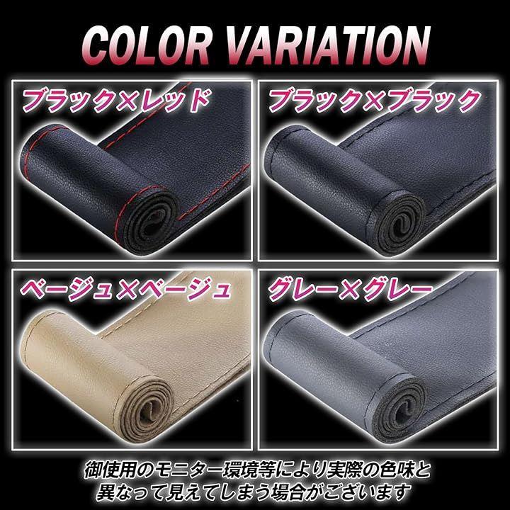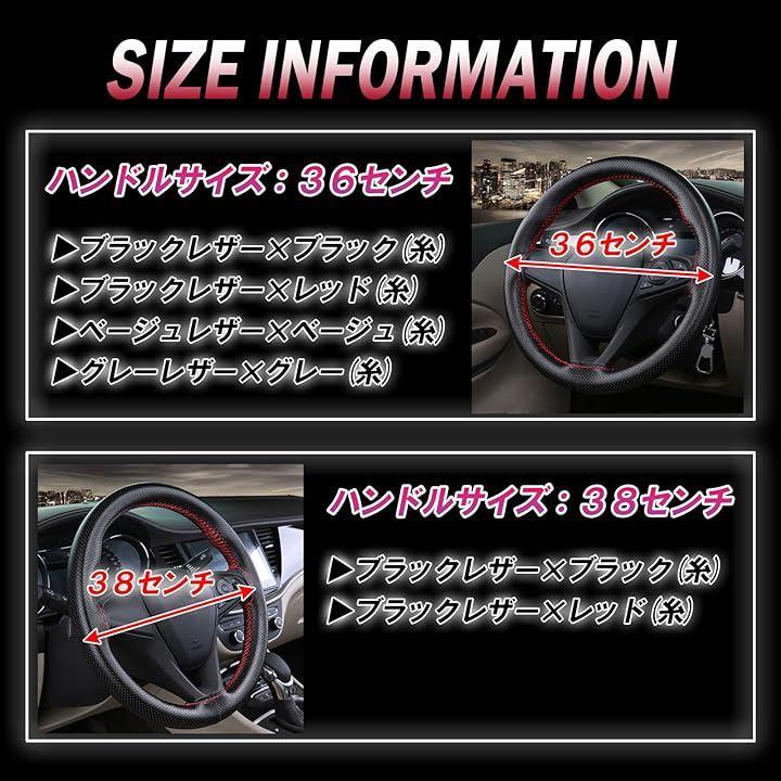 「サイズ」ハンドル(ステアリング)径 「36cm」「38cm」「カラー」「ブラックレザー、ブラック糸」「ブラックレザー、レッド糸」「グレーレザー、グレー糸」「ベージュレザー、ベージュ糸」ハンドル径36cmとハンドル径38cmに対応したバリエーションがありますので、スポーツから軽トラまで幅広い車種に対応できます。