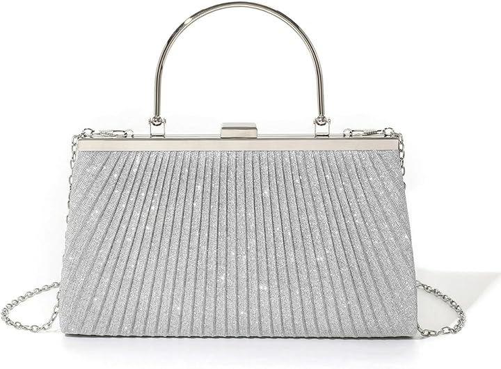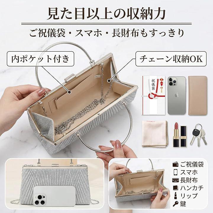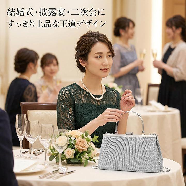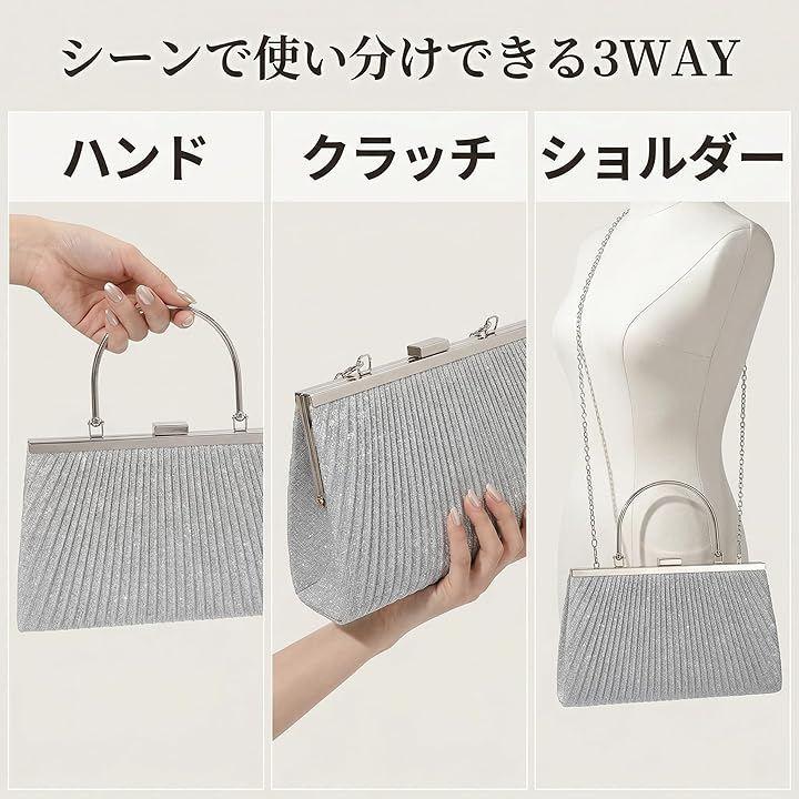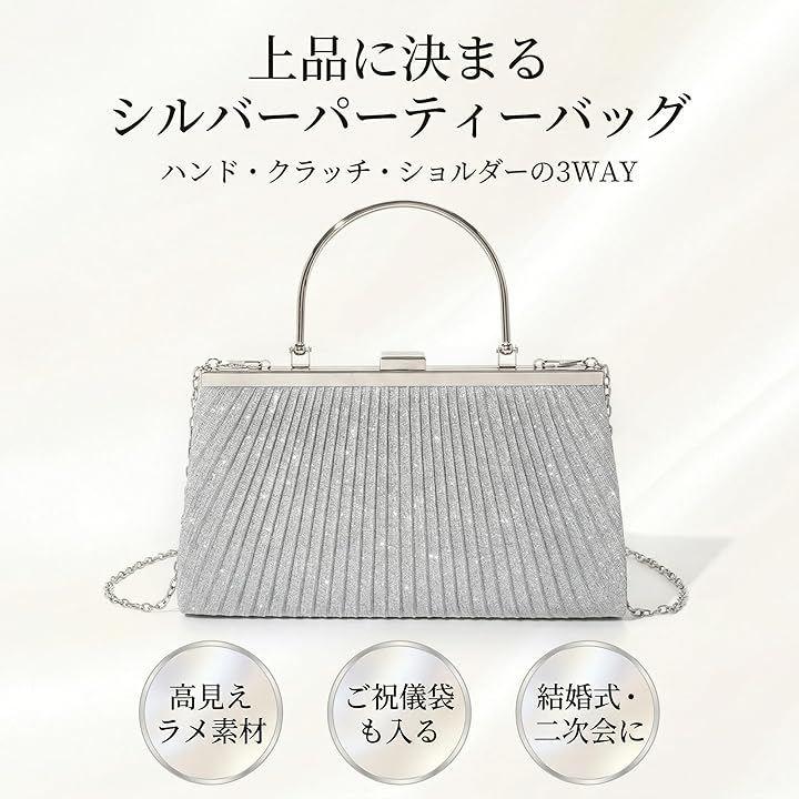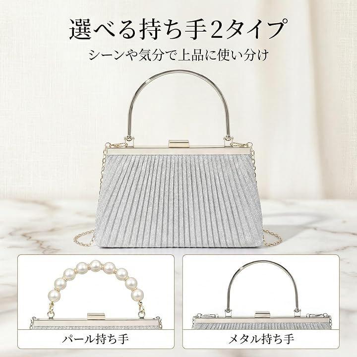 「上品なきらめきと実用性を兼ね備えたクラッチバッグ」光を受けて繊細にきらめくラメプリーツ生地を使用した、26cmx15cmx5.5cmのコンパクトバッグ。