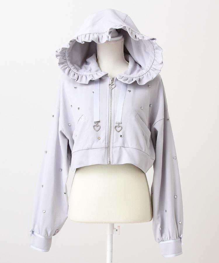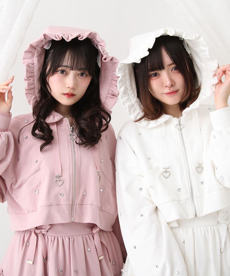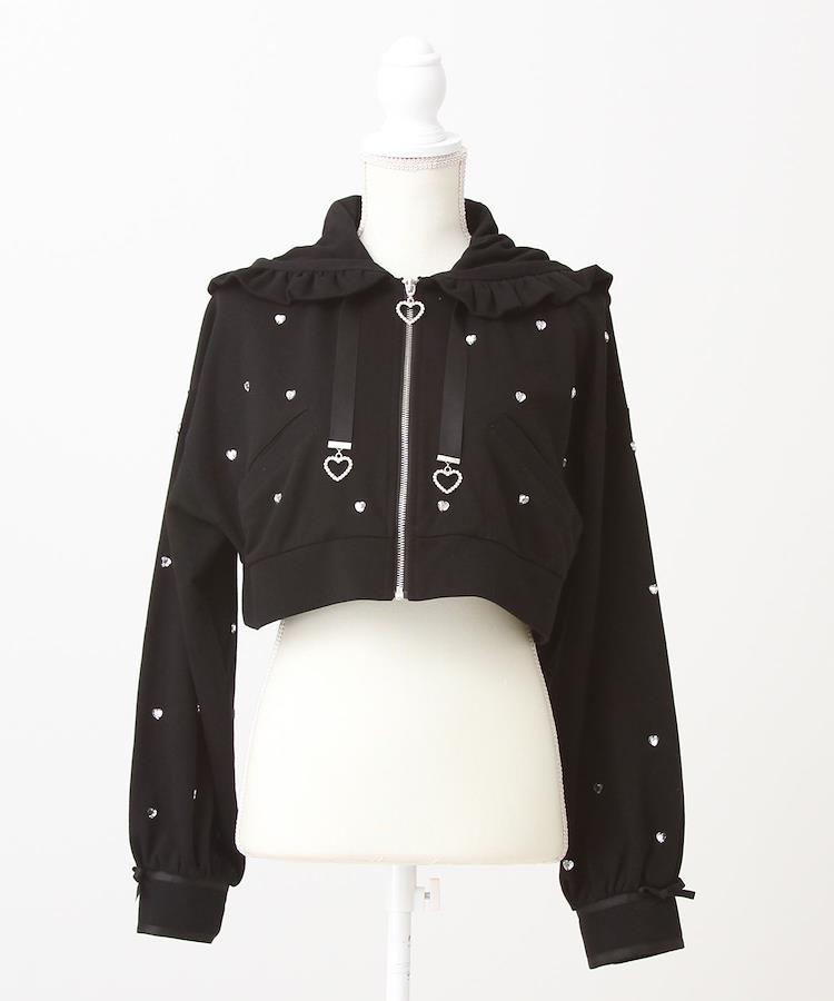 ハートストーンがキラキラ輝くかわいいフリルショートパーカーが登場♪【デザイン】ハートストーンが散りばめられたかわいすぎるフリルフード付きのパーカーです。キラキラと輝き目を惹くかわいさになっています!フード紐とファスナー先にはハートのキラキラチャームがついています♪丈感はショートパーカー丈になっています。同じハートストーンが散りばめられたスカートと一緒に合わせるとトレンド感のあるコーデに変身♪かわいすぎるショートパーカー、是非ともオススメのアイテムです♪【素材】厚すぎず薄すぎない裏毛生地です。【コーディネート】お揃いのハートストーン裏毛スカートと合わせてコーデすると、トレンド感あるスポーティーでかわいいコーデが完成します♪普段のハイウエストデザインスカートにも合うのでこれからの季節に1枚かわいい羽織としても活躍するアイテムです!《透け感》なし 《生地の厚さ》普通 《裏地》なし 《伸縮性》なし《生産国》中国