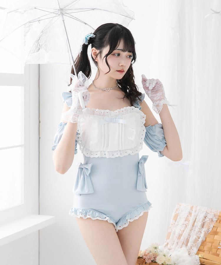 かわいくニーハイソックスと合わせて写真を撮るのもかわいく映える水着です!