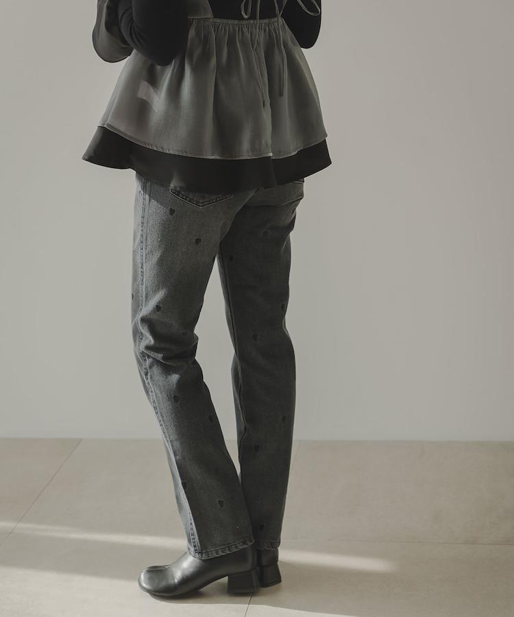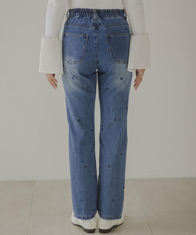 ハート柄刺繍がポイントドット見えが可愛いデニムパンツ【ディティール】一見ドット柄に見える刺繍はさりげないハートモチーフ。カジュアルなデニムに甘いポイントをプラスしました。ルーズ感がありながらも裾にかけてすっきりとしたテーパードシルエット。きれいめな印象に仕上がるので大人女子にぴったりです。バックウエストはゴム仕様になっており、リラクシーに履いて頂けます。【スタイリング】ストンと落ちるテーパードラインでヒール、フラットシューズ問わず合わせやいのも◎ジャストウエストで腰周りをすっきりと見せてくれ、トップスインやクロップド丈とのバランスの取りやすいのもポイント◎主張しすぎないドット柄がさりげないコーディネートのポイントになってくれます。**********************透け感:なし裏地:なし伸縮性:なし光沢感:なし生地の厚さ:普通**********************《生産国》中国