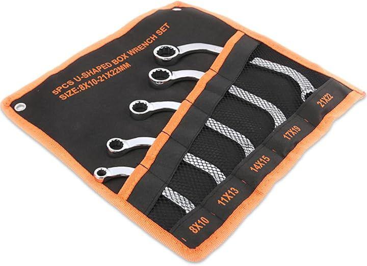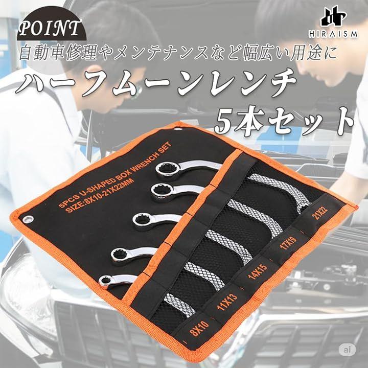 「自動車修理や機械メンテナンスなど幅広い用途に」自動車整備、自転車やバイクの修理、機械のメンテナンス、建設現場、家庭でのDIYなど、様々なシーンで活躍するハーフムーン(半月)型メガネレンチの5本セットです。