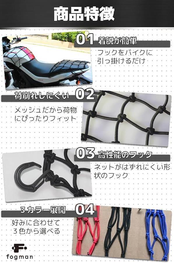 「商品特徴」着脱が簡単(1)フックをバイクに引っ掛けるだけ:荷崩れしにくい/(2)メッシュだから荷物にぴったりフィット:高性能のフック/(3)ネットがはずれにくい形状のフック:3カラー展開/(4):着脱が簡単 フックをバイクに引っ掛けるだけ 荷崩れしにくい メッシュだから荷物にぴったりフィット 高