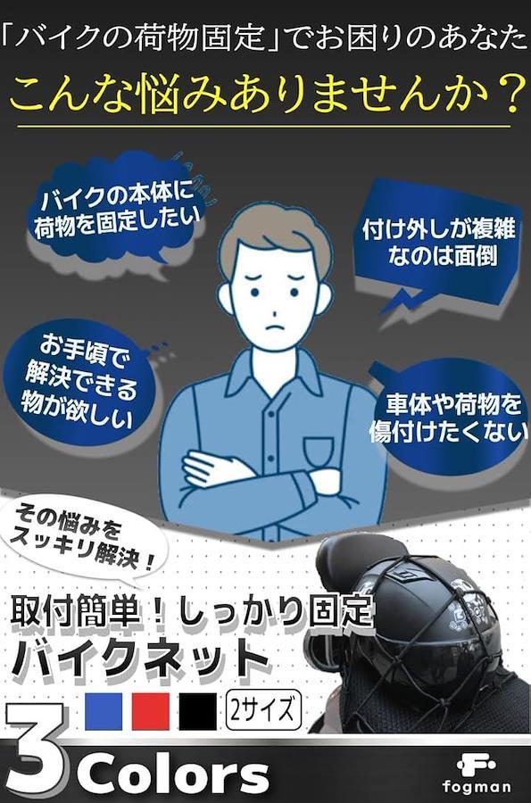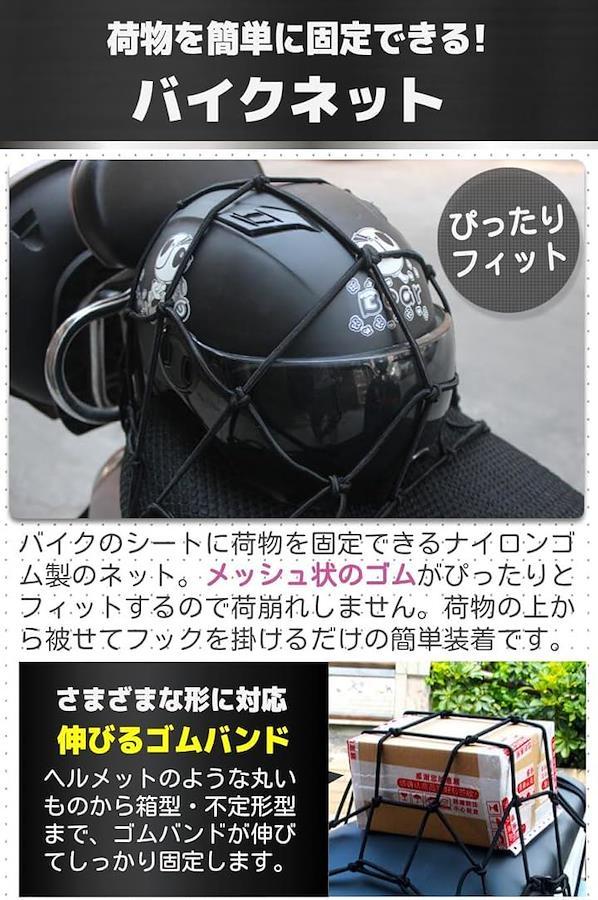「バイクネット」バイクのシートに荷物を固定できるナイロンゴム製のネット。