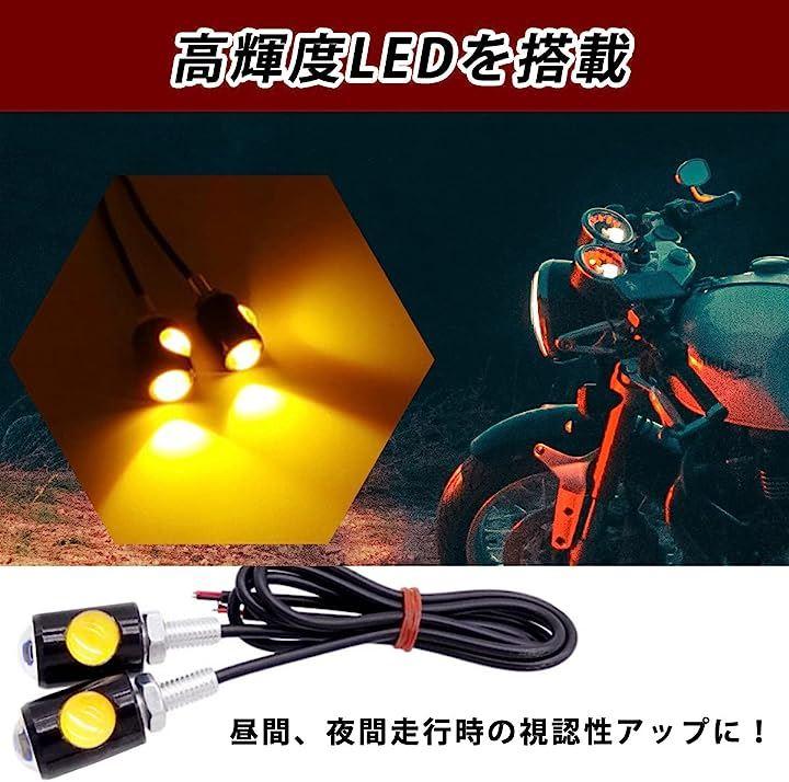・「動作電圧」:12V「電力」: 3W「発光色」:黄色「素材」: アルミニウム 「LED寿命」: 50000時間「防水性能」:IP65防水「サイズ」:本体 23mmx16mm ボルト部分 15mm M6ネジ「配線長さ」:35cm 「重さ」:13g「LED」:高輝度LED「使用方法」:赤線+、黒線- *LED商品のためハイフラ等になる場合があります。