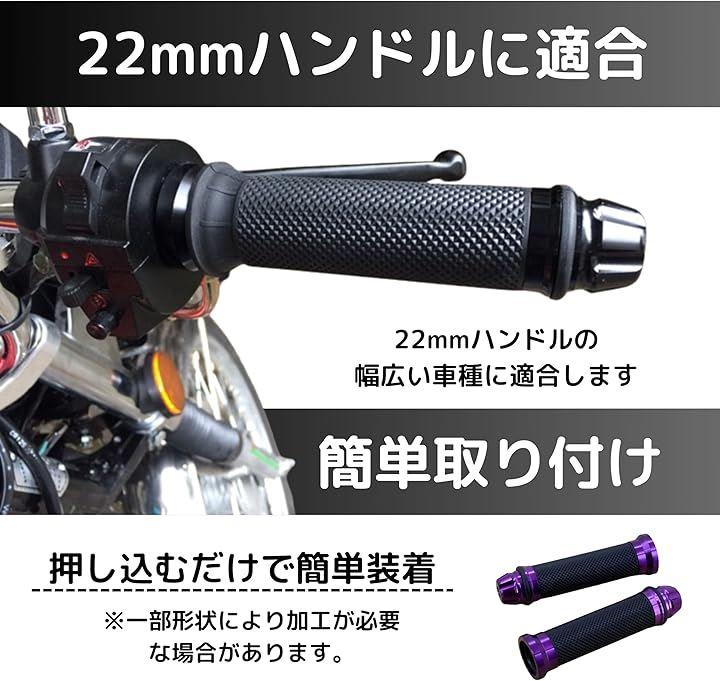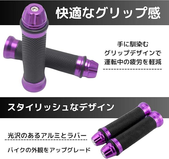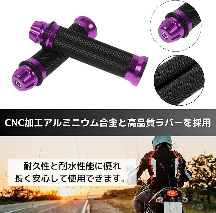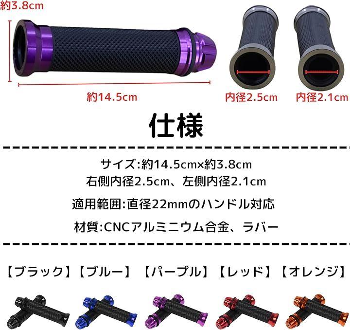 「仕様」サイズ:約14.5cmx約3.8cm、右側内径2.5cm、左側内径2.1cm、適用範囲:直径22mmのハンドル対応、材質:CNCアルミニウム合金、ラバー、カラー:紫/赤/青/オレンジ/黒