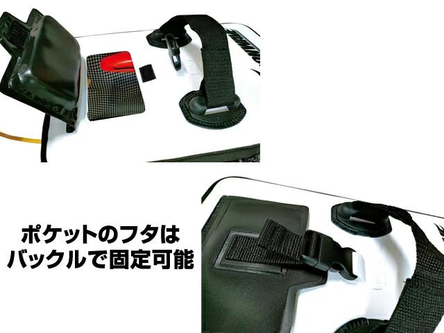 魚の出し入れに便利な大型ポケットは、バックルで固定可能。