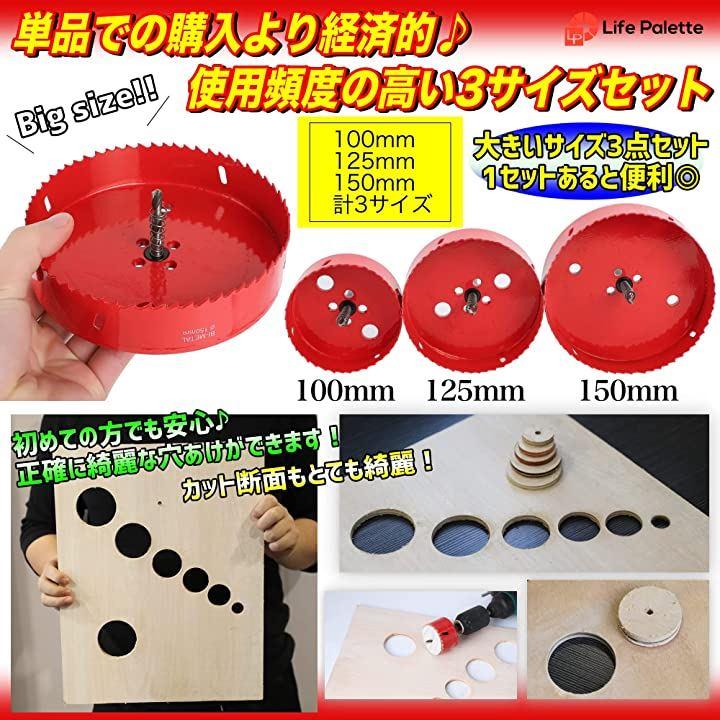 ・「大きいサイズを激選。100mm・125mm・150mm 大型サイズのホールソー3本セット」使用頻度の高い直径100mm・125mm・150mmの大型ホールソーを各1本3本セットにしました。