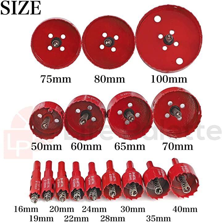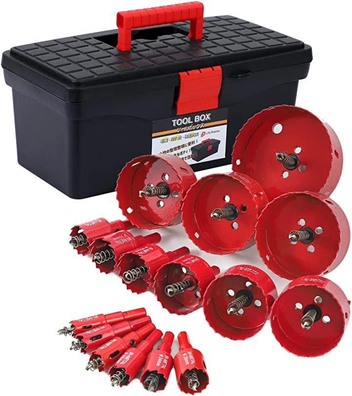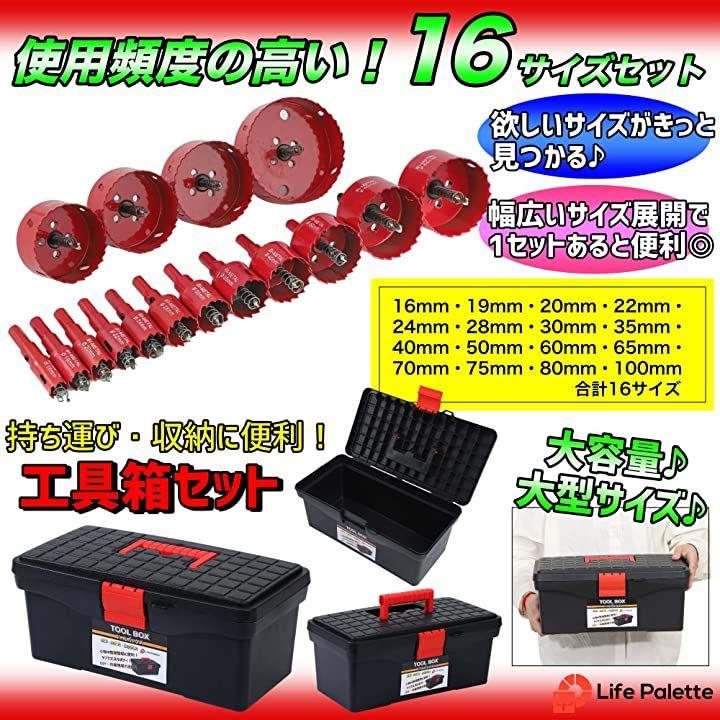 ・「使用頻度の高い16サイズを1セットに。持ち運びに便利な工具箱付きセット」バイメタルホールソー 直径16~100mm 増量16本セット(16mm 19mm 20mm 22mm 24mm 28mm 30mm 35mm 40mm 50mm 60mm 65mm 70mm 75mm 80mm 100mm)。
