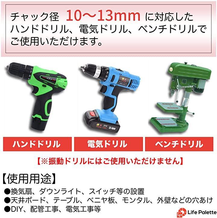「HSS(HighSpeedSteel)高速度工具鋼を使用」*材質:HSS センタードリルスプリング付き*軸形:写真参照(3本爪チャック式用6.35ミリ六角軸には使用不可)*適用機器:回転専用ドリル、ボール盤 電動ドリル等 (チャック10mm~13mm汎用型)*適用材質:アルミ板(3mm以下)、鉄板(3mm以下)、木材、プラスチック、石膏ボード等*使用用途:配管工事、電気工事、DIY等