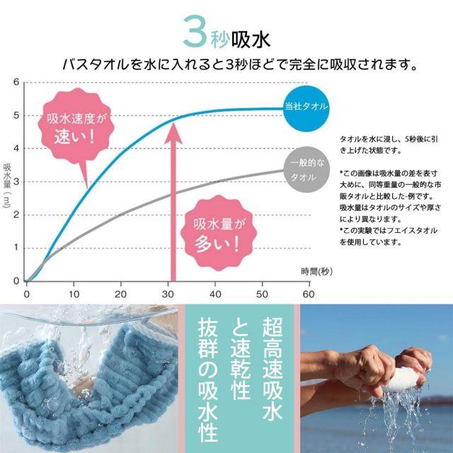 超微細繊維が生む驚異の吸水力:極細マイクロファイバーが水滴を瞬時に捕捉。綿タオルの3倍の吸水速度で肌や髪の水分をスピード除去。