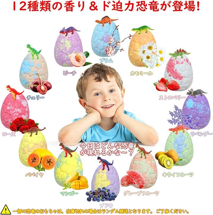 「エッグ型バスボム キッズセット」12個のカラフルなエッグ型バスボムが含まれており、それぞれ異なる恐竜が隠れています。