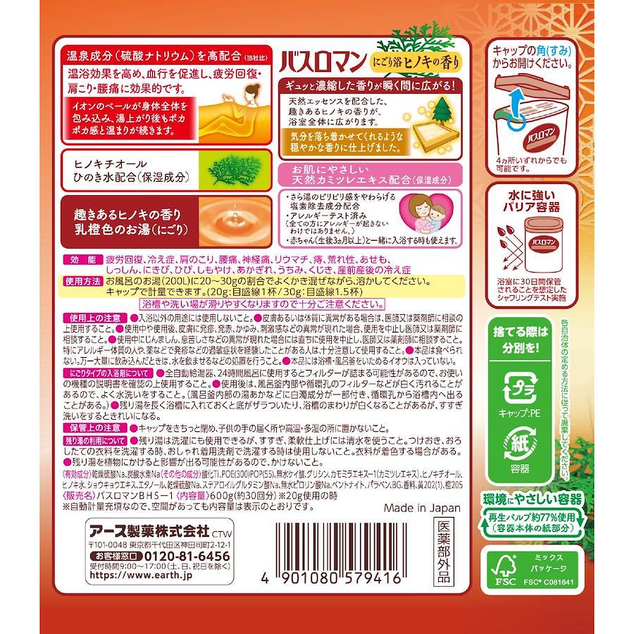 生産国:日本内容量:600g【香り】趣きあるヒノキの香り 【お湯色】乳橙色のお湯(にごり)【効果・効能】疲労回復、冷え症、肩のこり、腰痛、神経痛、リウマチ、痔、荒れ性、あせも、しっしん、にきび、ひび、しもやけ、あかぎれ、うちみ、くじき、産前産後の冷え症原材料: 【有効成分】乾燥硫酸Na、炭酸水素Na【その他の成分】酸化Ti、POE(300)POP(55)、無水ケイ酸、グリシン、カモミラエキス-1、ヒノキチオール、ヒノキ水、ショウキョウエキス、エタノール、乾燥硫酸Na、ステアロイルグルタミン酸Na、無水ピロリン酸Na、ベントナイト、パラベン、BG、香料、黄202(1)、橙205