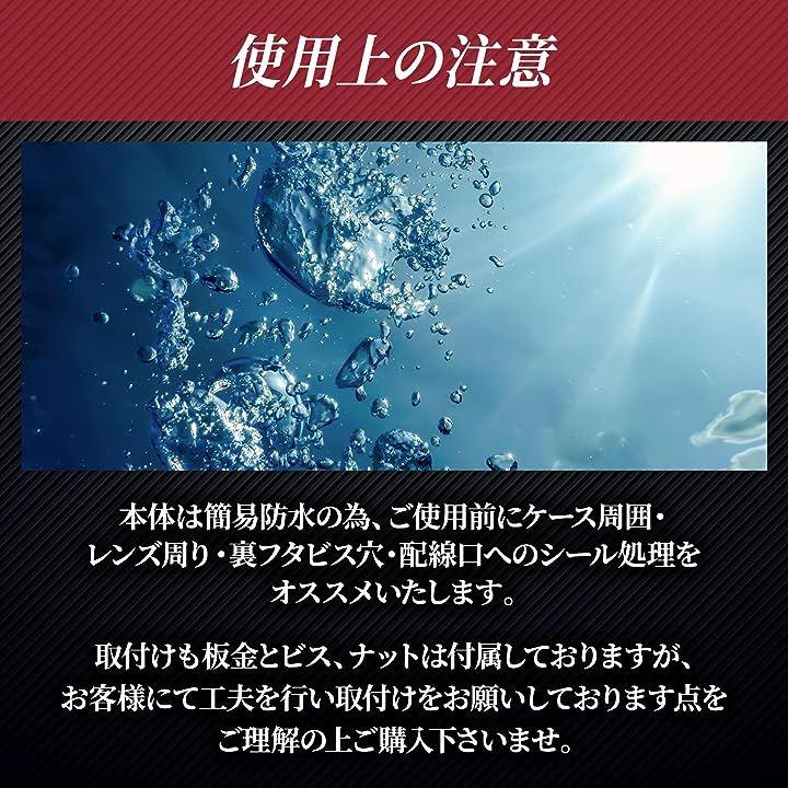 本体は簡易防水の為、ご使用前にケース周囲、レンズ周り、裏フタビス穴、配線口をシール処理をオススメいたします。
