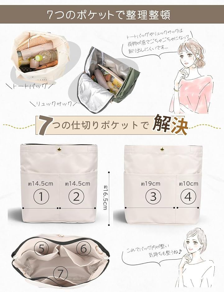 「7つの仕切りポケットで整頓上手」「カバンの中がぐちゃぐちゃ…」「小物が散乱して探しにくい」そんな時にあると便利なバッグインバッグ。