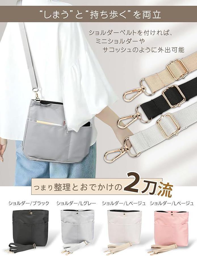 「整理と持ち歩くの二刀流」インナーバッグとして使うだけでなく付属の取り外しできるショルダー紐を使うとサコッシュとしても使ます。
