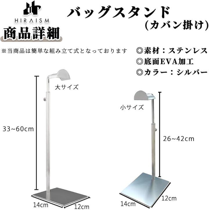 「商品内容」バッグスタンド (カバン掛け) 素材:ステンレス 土台サイズ:12x14cm <高さ調節幅> 小サイズ:26~42cm 大サイズ:33~60cm 備考:底面裏側はEVA加工済み (滑り止め) *当商品は簡単な組み立て式となっております。
