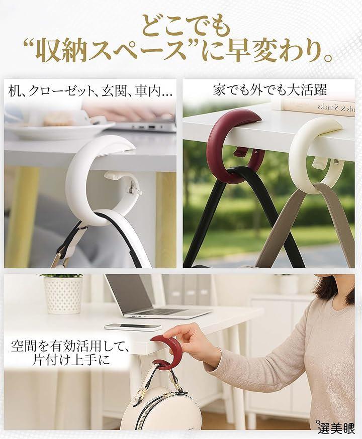 「様々なシーンで活躍」: フックの先端には滑り止めラバーパッドが付いており、バッグの滑り落ちを防ぐだけでなく、大切な家具の表面を傷から守ります。
