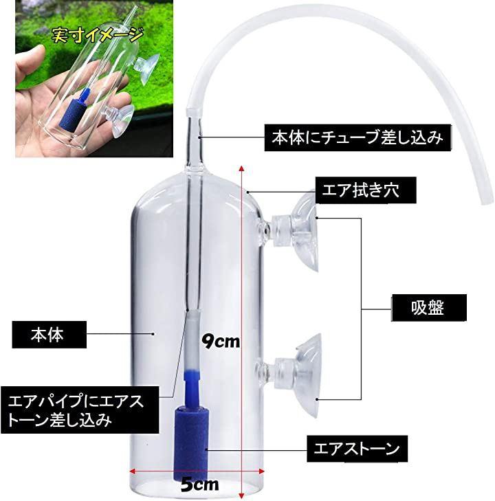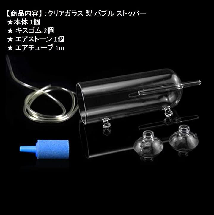 ・「 バブル ストッパー サイズ 」 :長 約 高さ12cm、直径5cm「セット内容」 :クリアガラス バブルストッパー ・本体 1個 ・ キスゴム 2個 ・ エアストーン 1個 ・ エアチューブ 1m