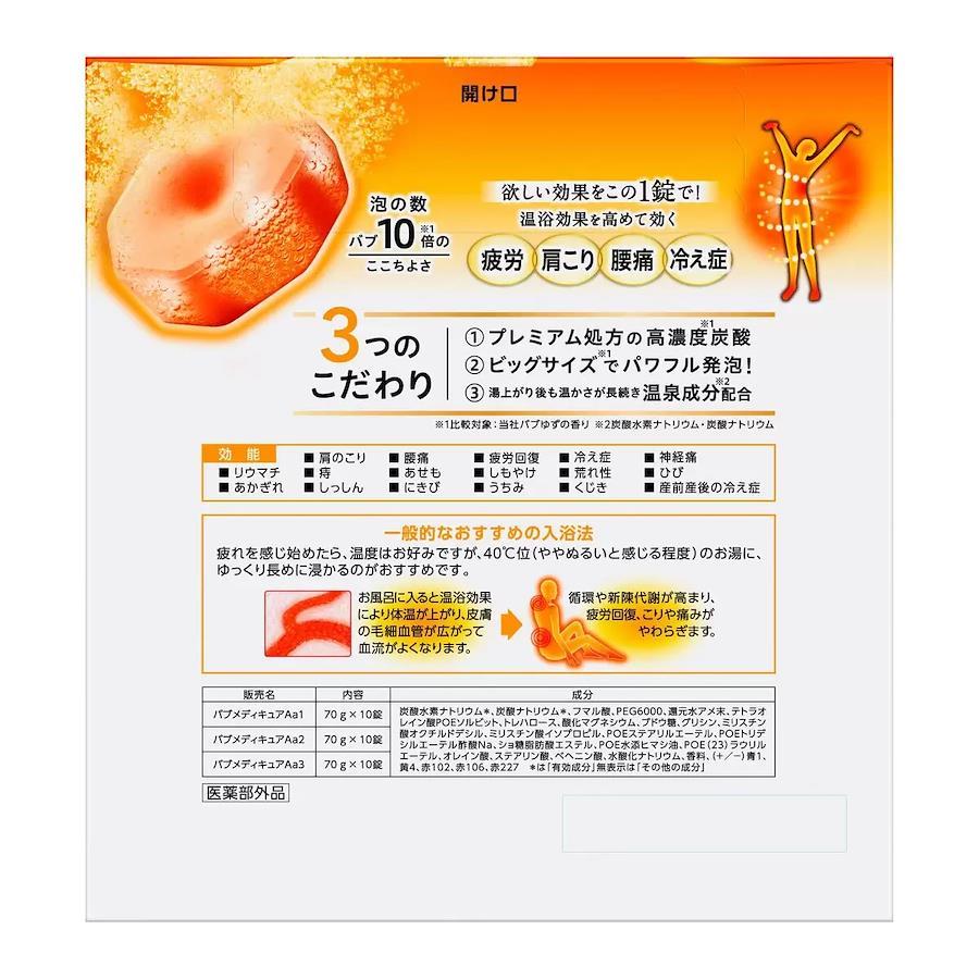 忙しい現代人の特に疲れがたまった時に。いつものオフロが高濃度※1炭酸のオフロに変わる!欲しい効果をこの1錠で。温浴効果を高めて、疲労・肩こり・腰痛・冷え症に効く。●泡の数バブ10倍※1のここちよさ●ビッグサイズ※1でパワフル発泡●温泉成分※2配合●気分まで和らぐ柑橘の香り 赤ちゃんと一緒に入浴する時も使えます。※1比較対象:当社バブゆずの香り ※2炭酸水素ナトリウム・炭酸ナトリウム【医薬部外品】販売名:バブメディキュアAa1/バブメディキュアAa2/バブメディキュアAa3