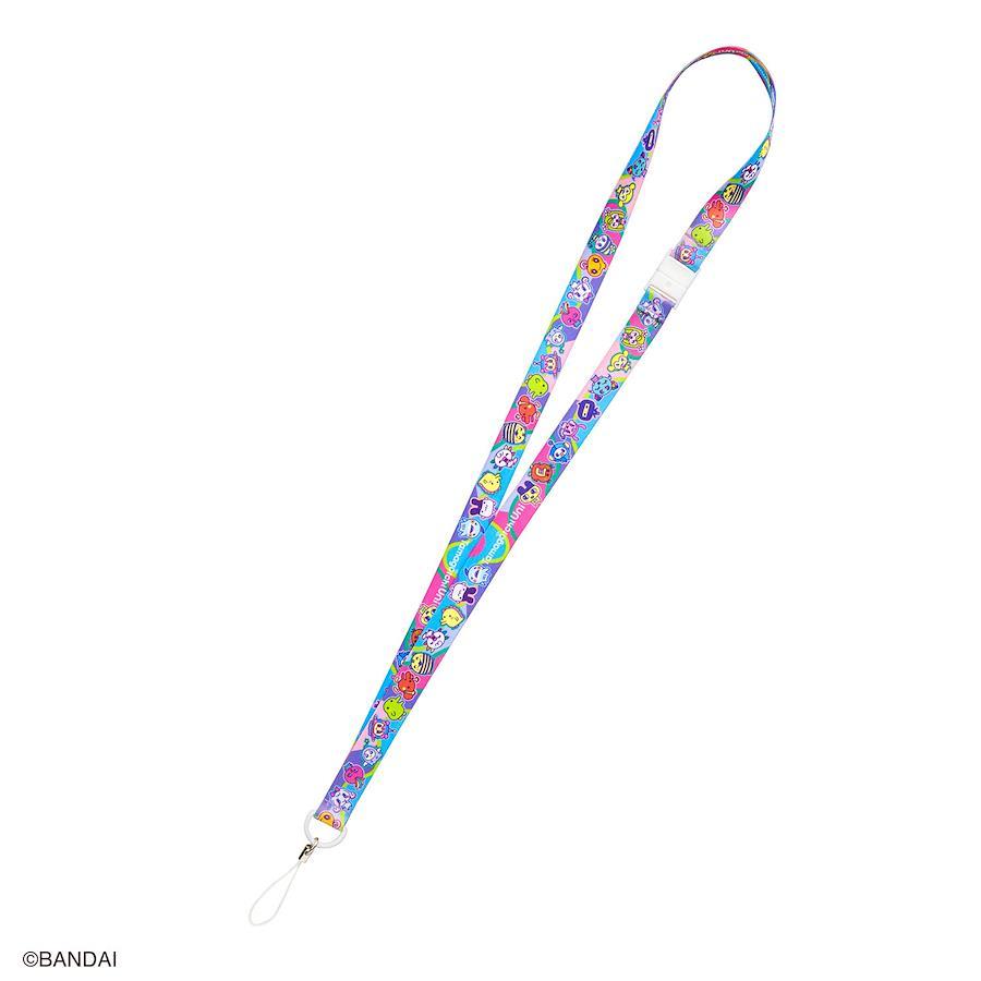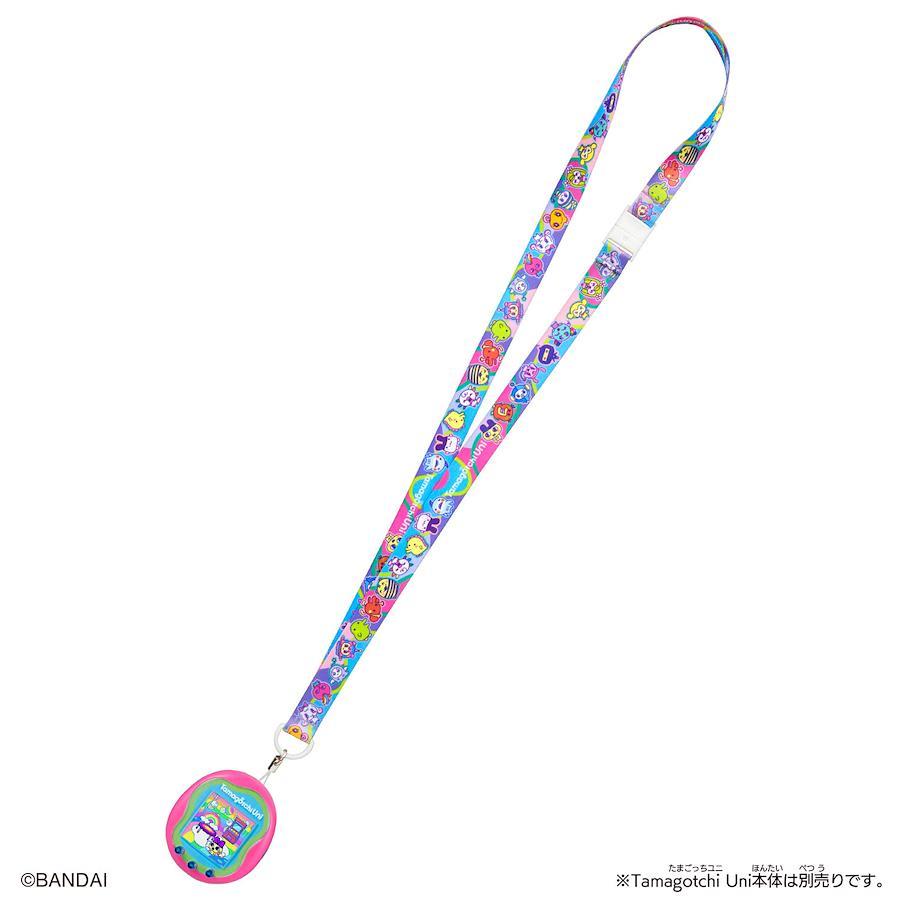 Tamagotchi Uni本体にぴったりなピンクやパープルを使ったマーブル模様で ユニークなキャラクター達がデザインされたネックストラップです。