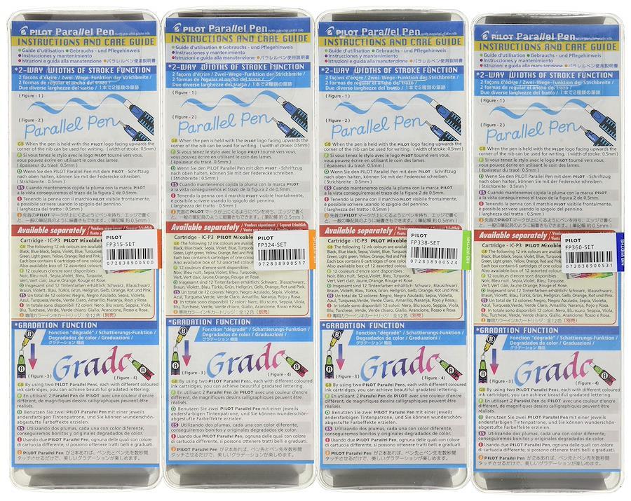 独自のパラレルプレート構造により、既存のカリグラフィーペンよりも美しくシャープな手書きができます。混色が可能 - 異なる色のカートリッジを入れた2本のパイロット パラレルペンを使い、ペン先を接触させて美しいグラデーションの文字が書けます。各セット、パラレルペン4本、ペン先は4サイズ: 1.5mm(赤いキャップ)、2.4mm(オレンジのキャップ)、3.8mm(緑のキャップ)、6.0mm(青のキャップ)。