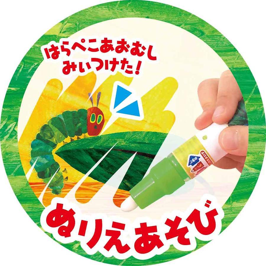 ●塗ると「はらぺこあおむし」の絵柄が現れ、発見遊びができます。