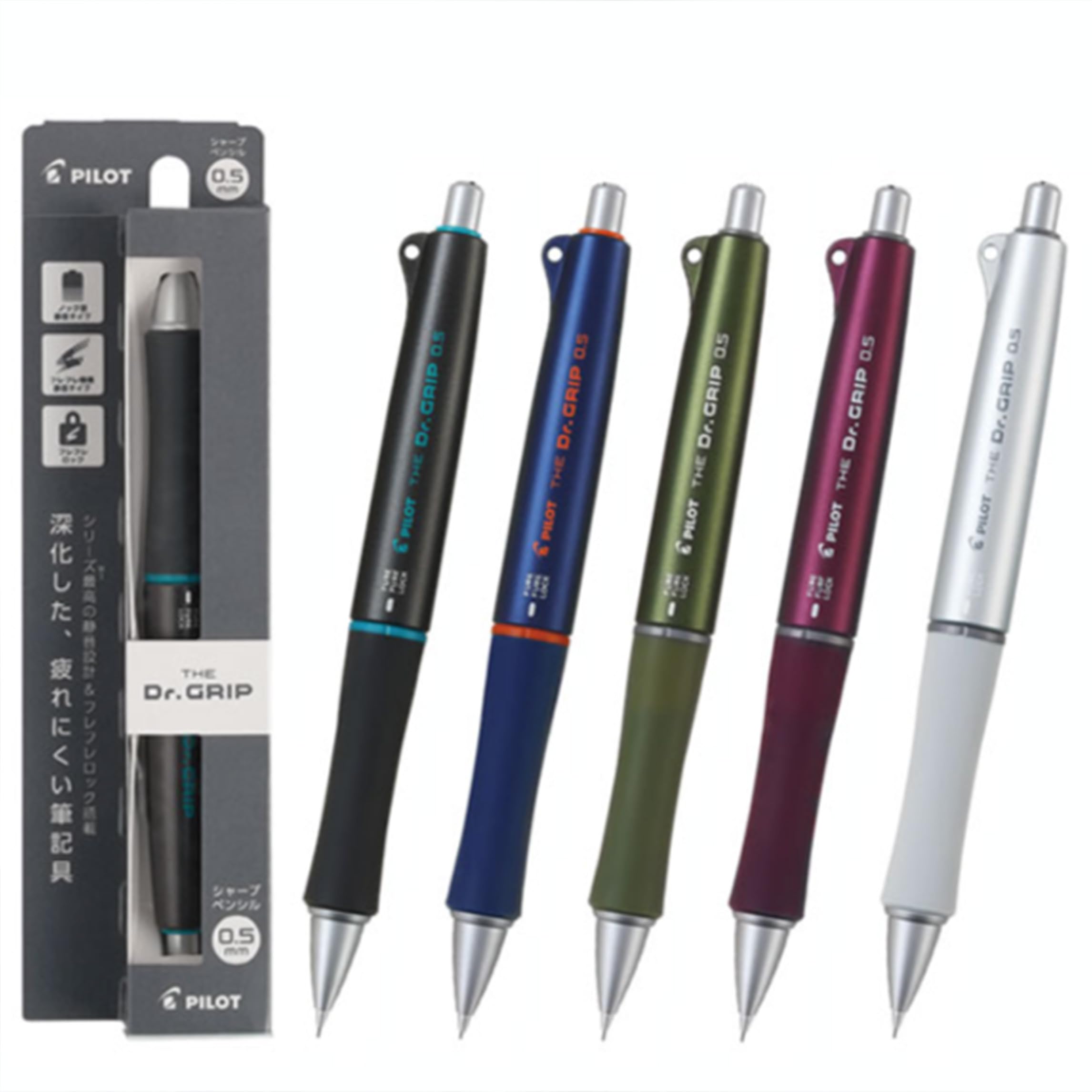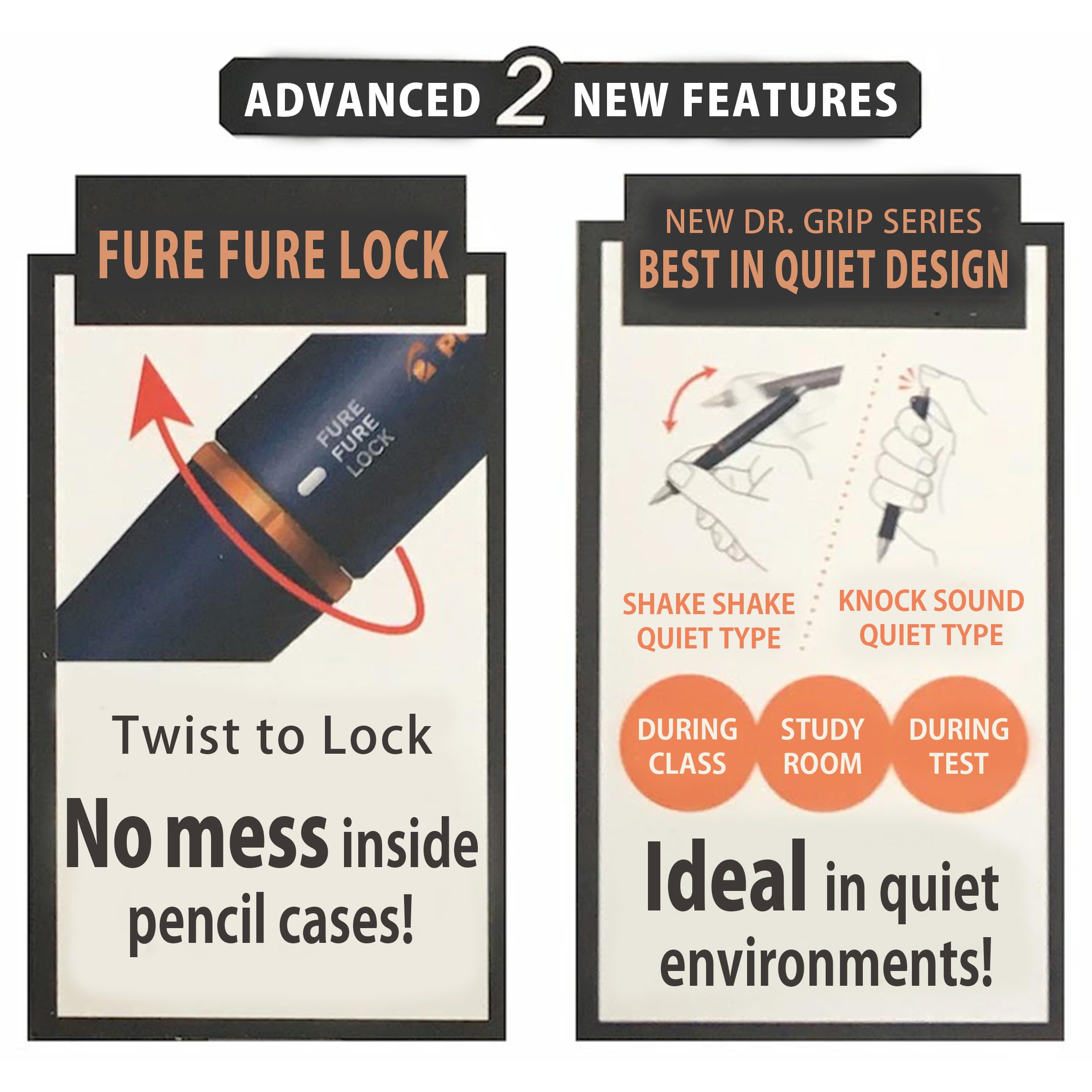 人間工学に基づき、筆記にかかる負担を軽減した疲れにくい軸径のグリップを採用した「ドクターグリップ」。 従来のドクターグリップからさらに使い心地をアップグレードしたハイエンドモデルです。 「フレフレ機構」搭載で、振るだけで芯が出るため持ち替えることなくノンストップ筆記が可能。 また、移動中のあやまってフレフレ機構により芯が出てしまうことを防止する「フレフレロック」機構を搭載。 ノブのノック音やフレフレ機構の動作音を抑えた静音設計で、静寂な中での使用に支障を与えません。