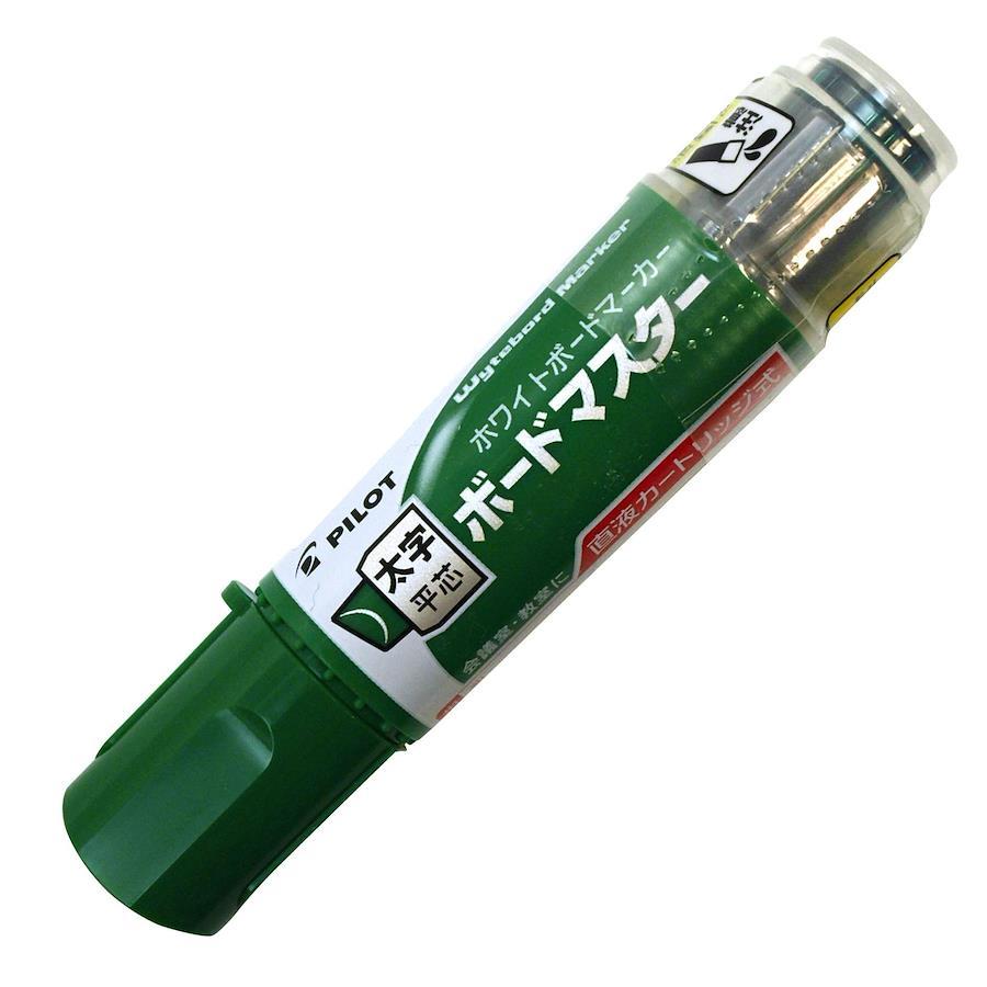 「濃くハッキリ書ける」直液カートリッジ式ホワイトボードマーカー「ボードマスター」です。。。ペン先:太字平芯。インク色:グリーン。カートリッジ品番:PWMRF8。。※一部画像に他のカラーの商品を使用しております。。。サイズ:縦=114mm 横=25mm 厚さ=25mm。商品色傾向:緑。。