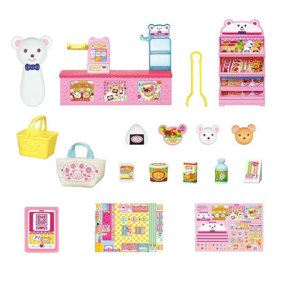 たべものパーツをしょうひんだなやホットスナック台にセットして、くまさんコンビニを開店!くまさんスキャナーで商品をスキャンすると、くまさんがおしゃべりします(音とおしゃべりは全部で20種類)。たべものパーツは全部で9個。トングでにくまん・ピザまんをつかんで取ったり、スマートフォンでお会計遊びも! (C)メルちゃん 対象年齢 :3才以上 セット内容:スキャナー、レジ台、トング、しょうひんだな、かいものかご、マイバッグ、おにぎり(さけ)、ハンバーグべんとう、にくまん、ピザまん、ポテトチップス、くまさんプリン、オレンジジュース、おちゃ、サンドイッチ、スマートフォン、シールシート、床シート(シートサイズ:600×430mm) くまさんスキャナーでピッ!くまさんコンビニでおかいものしましょ?