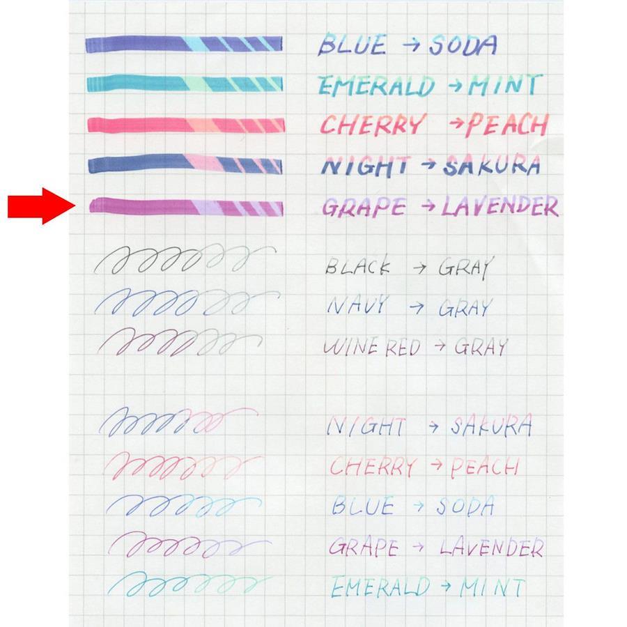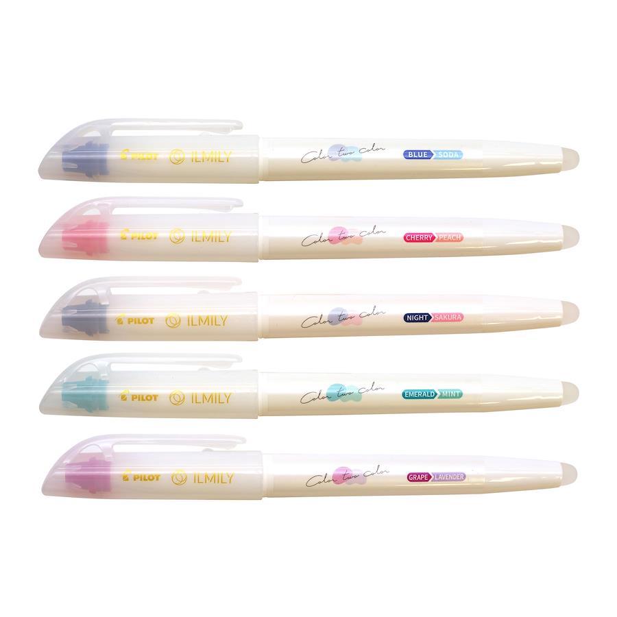 「ILMILY。Color。two。color」のマーカー。。ペン後部の専用ラバーでこすると筆跡の色を変化させることができるマーカーです。インキ色は同系色で濃い色から薄い色へと変わる3色と、数量限定の2色を加えた計5色がラインアップ。ノートや手帳へのデコレーションやマーキングはもちろん、色の変化で2色を楽しめるため紙面を華やかに彩ることができます。。※詳細画像に一部別カラーの商品を使用しています。。サイズ:縦=138mm 横=13mm 厚さ=18mm。商品色傾向:紫。。表紙パターン:タイポグラフィー。