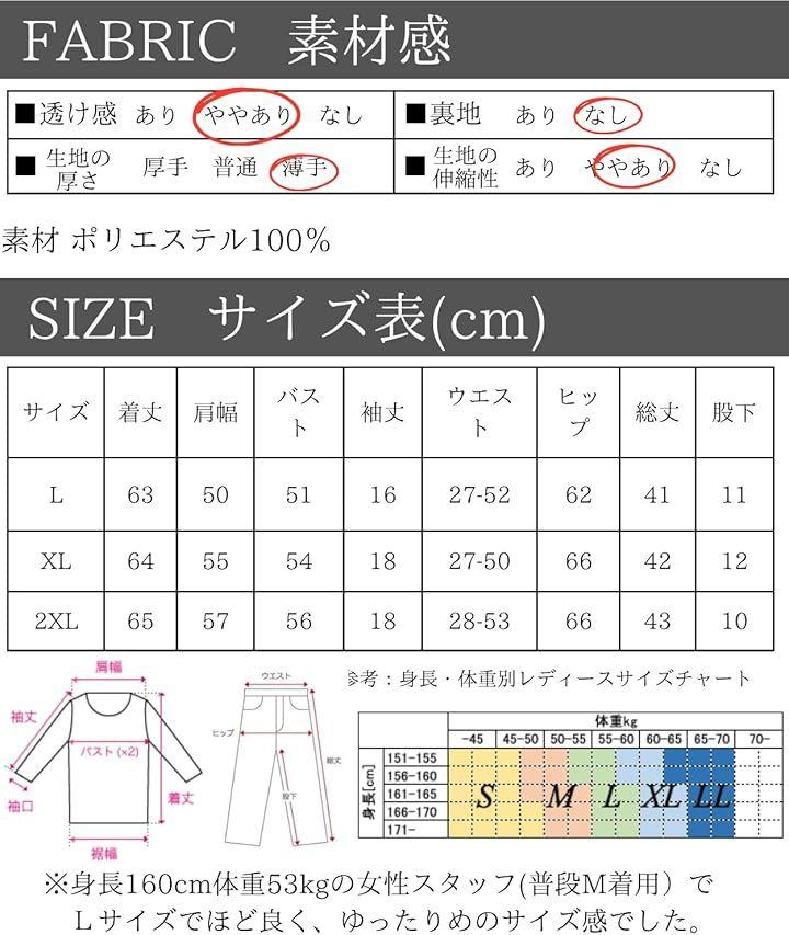 「素材」ポリエステル100% 「柄」2タイプ 「サイズ(cm)」L 着丈63/バスト51/肩幅50/袖丈16/ウエスト27-52/着丈41/股下11/ヒップ62 XL 着丈64/バスト54/肩幅55/袖丈18/ウエスト27-50/着丈42/股下12/ヒップ66/ 2XL 着丈65/バスト56/肩幅57/袖丈18/ウエスト28-53/着丈43/股下10/ヒップ66