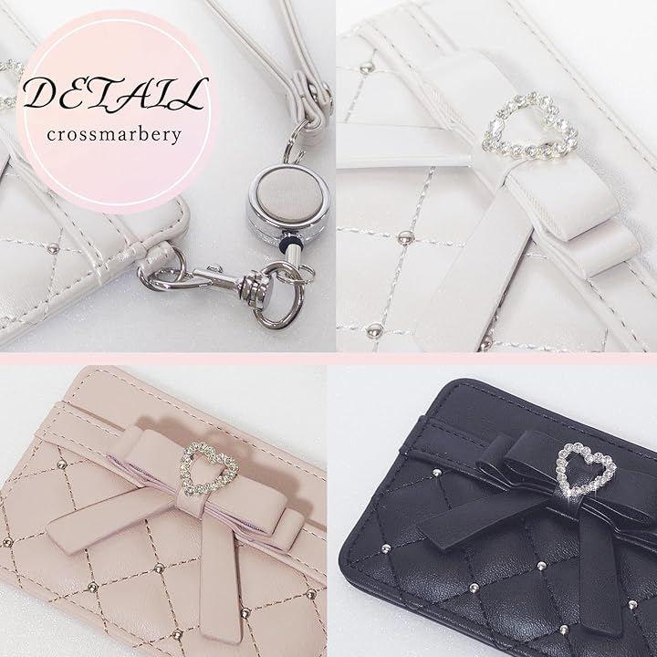 Cute and stylish black stretchable pass case with reel, horizontal design, fits IC cards, strap, ribbon, heart, jeweled quilting, perfect for commuting to work or school
