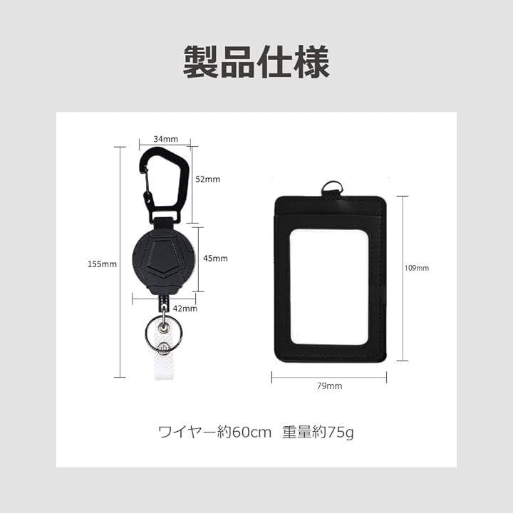 「製品仕様」リール全長155cm 幅42mm ワイヤー約60cm パスケース幅79mm 高さ109mm 重量約75g