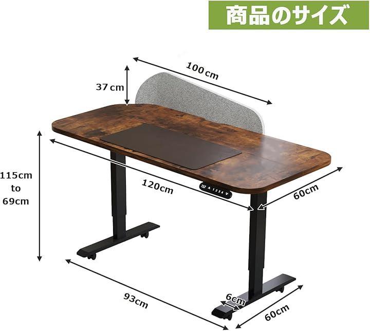 「商品仕様」*天板サイズ:約幅120CMx奥行60CM *天板は2分割 *本体重量:約32KG * 耐荷重80KG *高さ調節範囲:69-115CM(厚さ:2CM、高さ71-117CM) *材料:化粧合板、鋼鉄合金材料