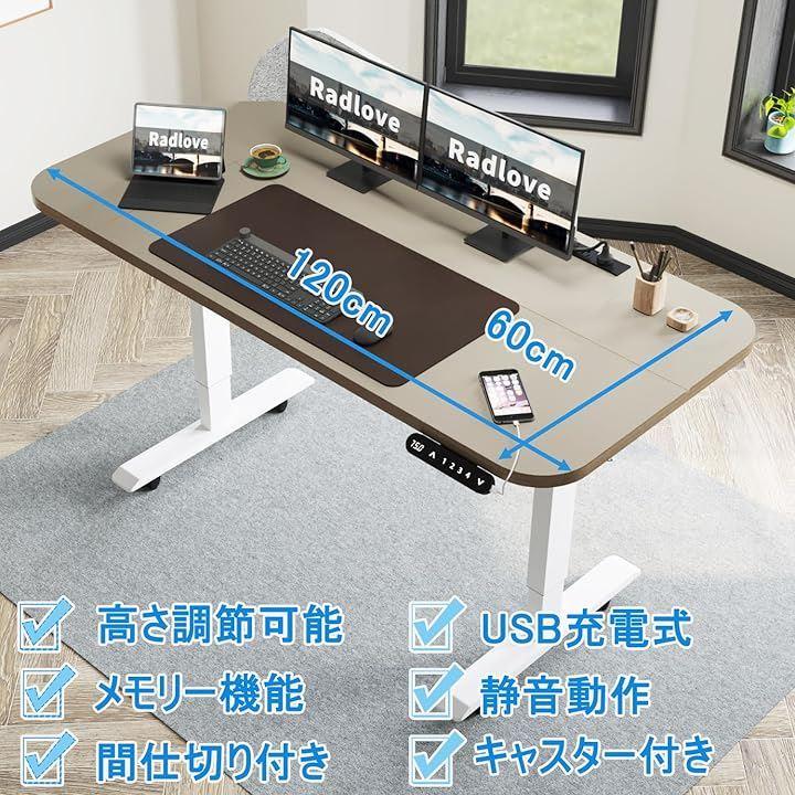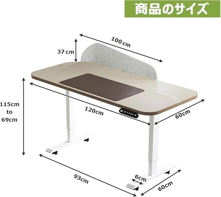 「商品仕様」*天板サイズ:約幅120CMx奥行60CM *天板は2分割 *本体重量:約32KG * 耐荷重80KG *高さ調節範囲:69-115CM(厚さ:2CM、高さ71-117CM) *材料:化粧合板、鋼鉄合金材料