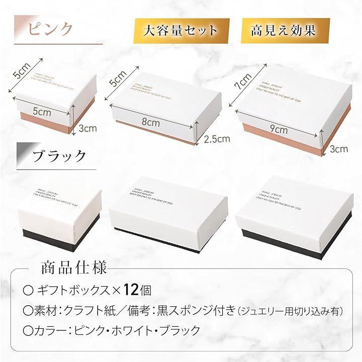 「商品仕様」ギフトボックス(12個セット)/サイズ:マルチサイズ/素材:クラフト紙/備考:黒スポンジ付き(ジュエリー用切り込み有)/カラー:ピンク・ホワイト・ブラック